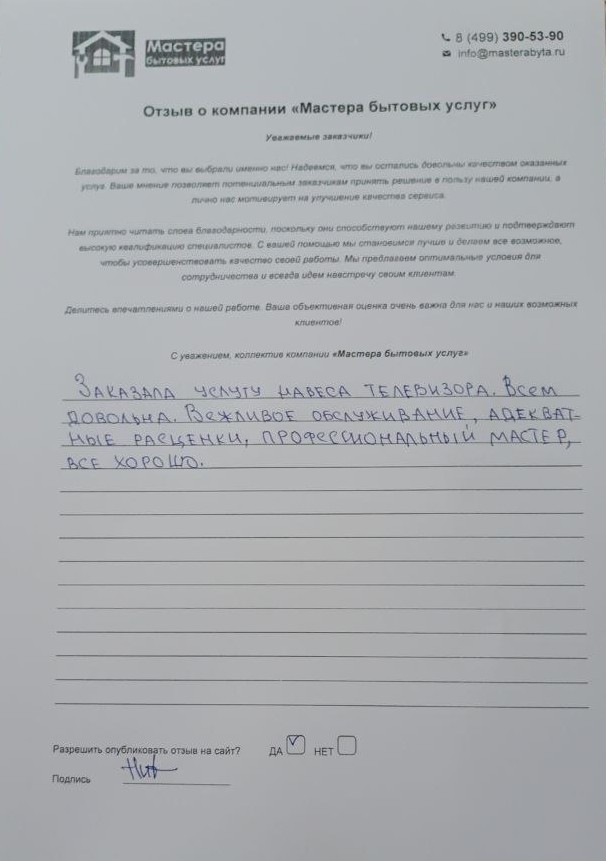 Заказала услугу навеса телевизора. Всем довольна. Вежливое обслуживание, адекватные расценки, профессиональный мастер, все хорошо.